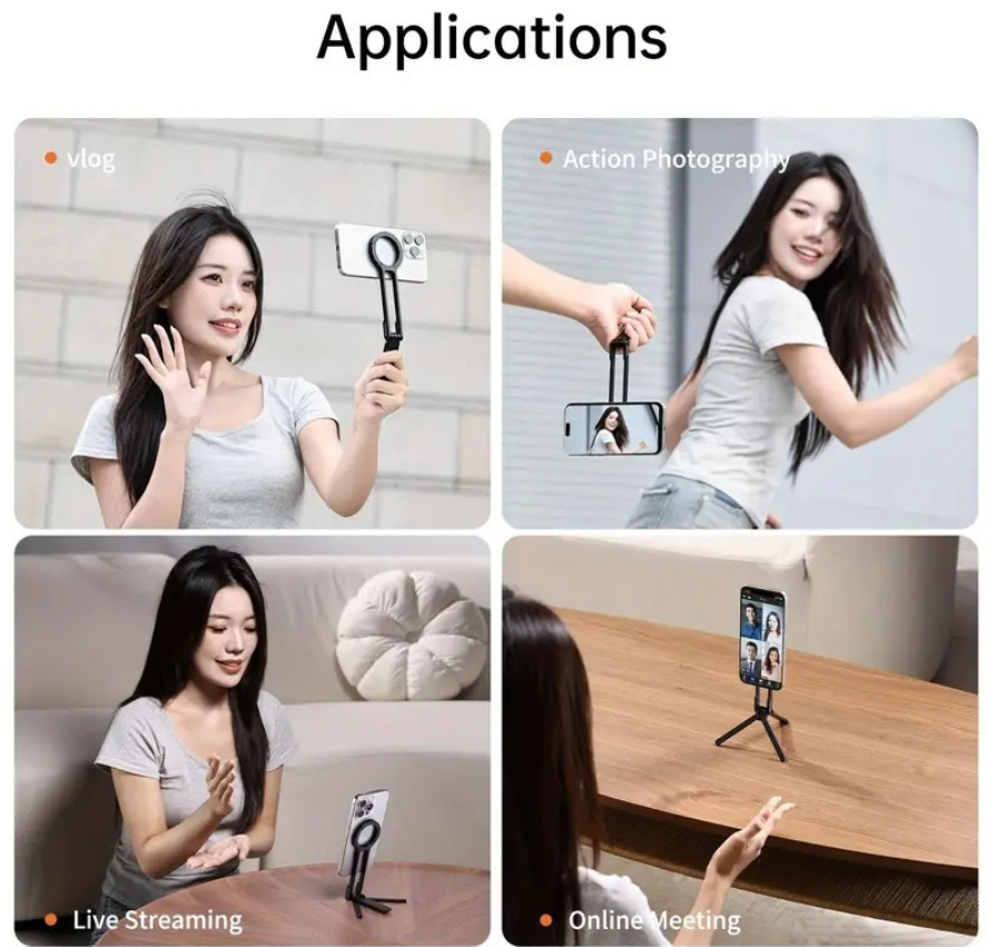 This sleek, lightweight stand combines a strong magnetic ring with a foldable tripod design, making it the perfect companion for your phone. The magnetic ring securely holds your device (compatible with MagSafe or metal plate attachments), while the adjustable hinge and tripod legs let you tilt and position your phone at the ideal angle for hands-free video calls, streaming, or content creation. Its compact, foldable structure allows for easy storage in a bag or pocket, ensuring you can set up your phone anywhere—at your desk, on the go, or for creative shoots. Crafted from durable materials, it provides stable support without scratching your device, blending functionality with minimalist style.