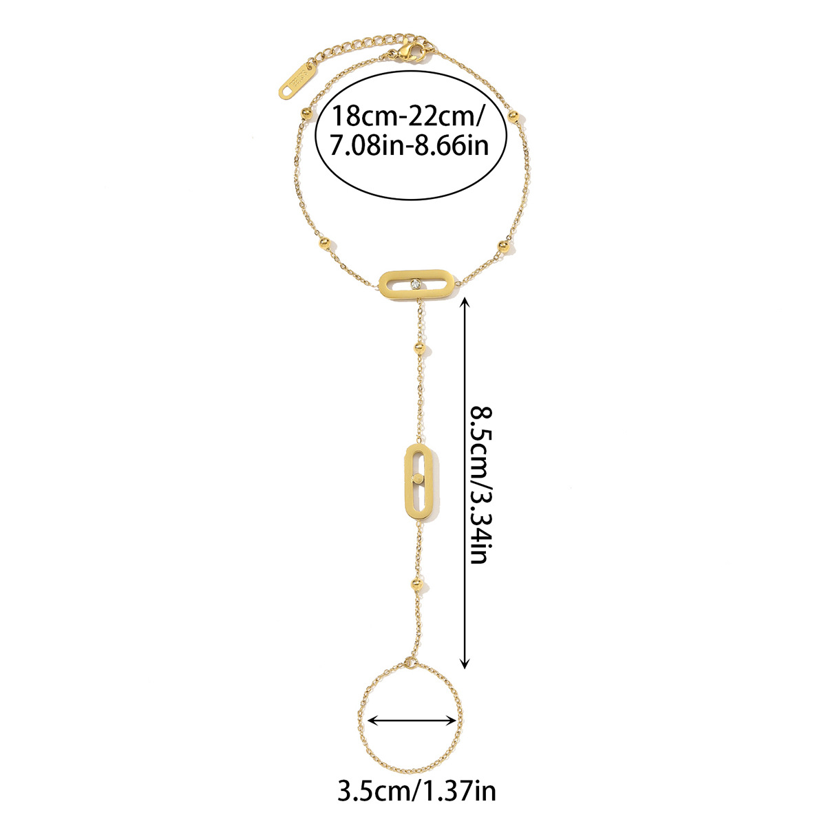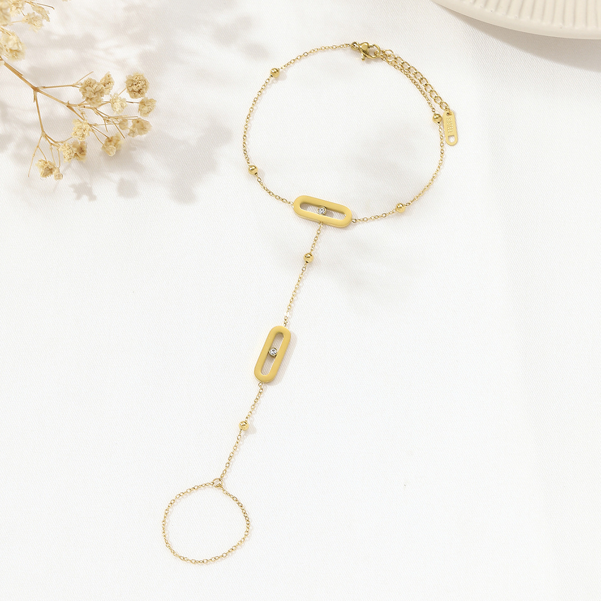 Geometric temperament hand chain with a sleek linked design. Crafted in matte gold, it features oval hollow links with subtle sparkling stones, connecting your wrist and finger for a modern, elegant look.