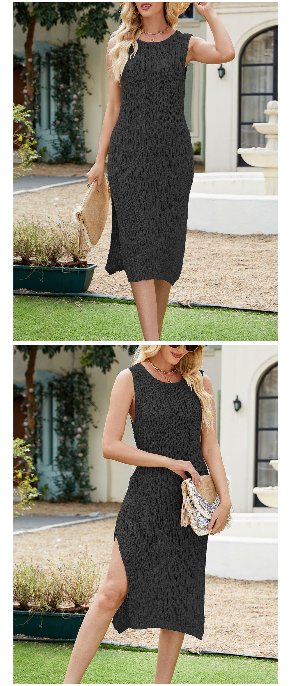 Sleeveless Knit Midi Dress with Side Slit – Effortless casual chic in soft viscose knit, perfect for beach days and weekend outings.